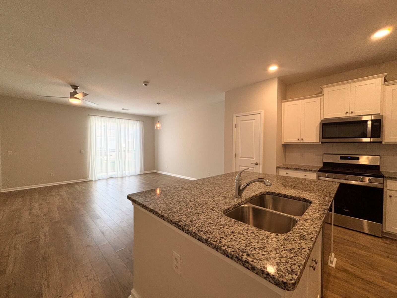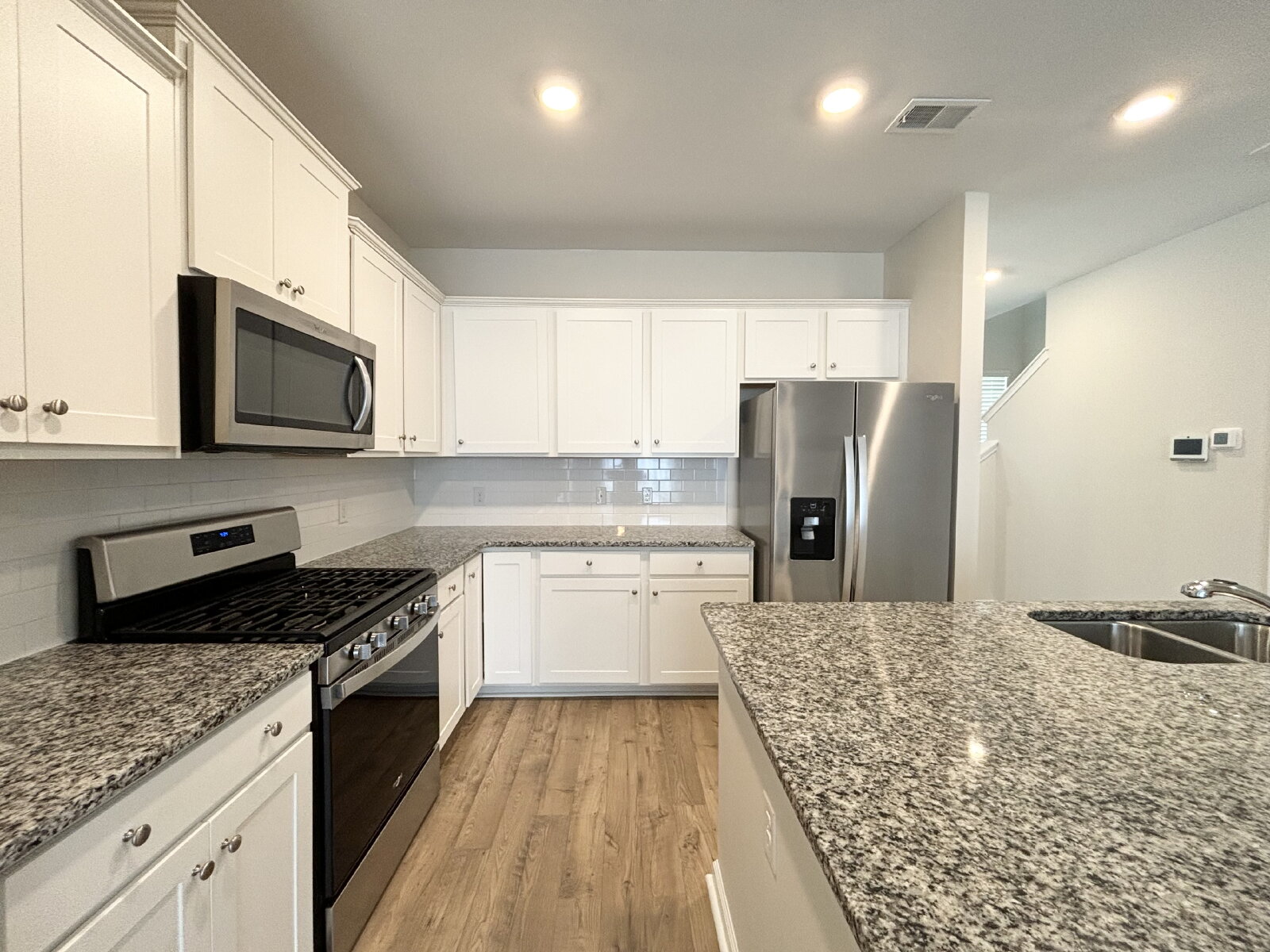 If you're looking for an open and airy rental home, your search stops here! This three-bedroom, two-and-a-half bathroom townhome with a one-car garage is for you. This home has a large open kitchen with stainless steel appliances, granite countertops, white cabinets, and an island for extra seating. The first floor has solid flooring throughout, a half bathroom, and a sliding glass door off the living room that opens up onto the patio & fenced-in outdoor area. All bedrooms and laundry areas (washer and dryer included) will be located on the second floor. The master has tray ceilings, a double vanity in the bathroom, and a walk-in shower.